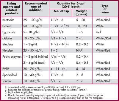 The table above lists common, commercially available fining agents for clarifying white and red wines, along with the recommended rate of addition and the type of wine where it is most effective, and other products used to improve the effectiveness of fining agents. Always start with the lowest rate of addition in the recommended ranges, and increase the rate, as required, if the wine requires further clarification.