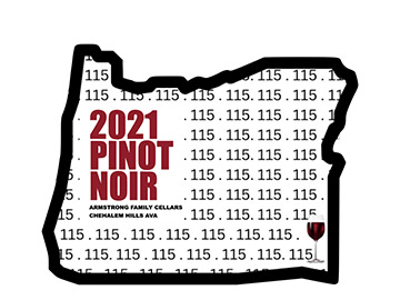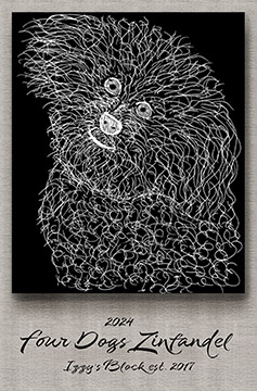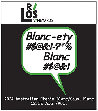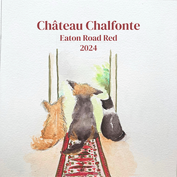 “The label was designed by my son, Drew, as a Christmas gift for me last year. This is all original artwork and the sleek, minimal design captures the view of our art-deco style house as you look uphill through the gently sloped main vineyard. We have 160 vines of mainly Syrah, Grenache, Mourvèdre and Viognier on our two-acre property, which we co-ferment into a red blend.”
