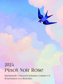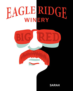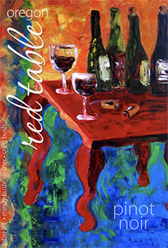 “I found this wine quiet, simple, even a little sweet. This image came to me in a dream. This is a picture of a marsh and my dog standing, staring into the fantastic, colorful sunset. The wine itself reminded me of this kind of scene, because it ends with a very full mouth, and yet quietly. This is a watercolor with the dog painted on top of it in acrylic. I also used Photoshop to lay in the other aspects of the label.”