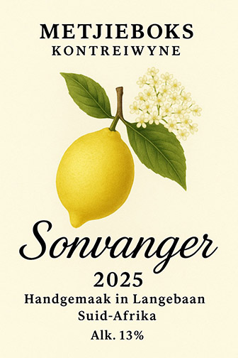 “I am a home winemaker on the west coast of South Africa. I make grape wines, but also established a label for my fruit wines. The name of my fruit wines is Metjieboks Kontreiwyne. This is in the local Afrikaans language. Loosely translated it means “Matchbox Country Wines.” The word metjieboks, or matchbox, is the family nickname of our seaside house, where my garage cellar is situated. It is a boxy upright house. The wording at the bottom means “Handcrafted in Langebaan, South Africa.”