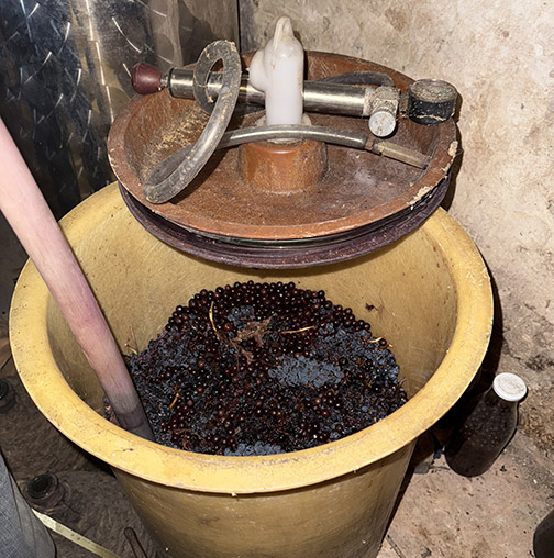 Fifteen buckets of grapes later, we loaded up the trailer attached to a tractor and headed to the cellar where we transferred whole bunches to the old French oak barrels. Jacques, taking breaks from lunch preparation, pumped carbon dioxide into the barrels to create the anaerobic environment that triggers intracellular fermentation within the whole, uncrushed grapes we just picked.