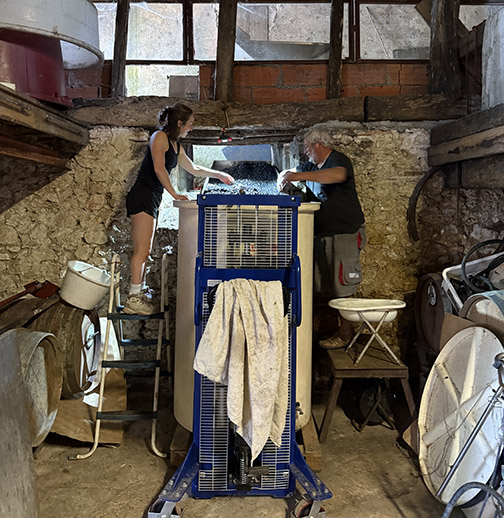 In the cellar, we poured baskets of grapes into a machine that sorted through the clusters, removing stems, rocks, and the occasional snail, before dropping individual grapes onto a slanted trough. Mary Banks and I picked through the grapes, manually removing stems that slipped through the cracks of the machine, ensuring only whole grapes made it into the giant stainless steel vat below. While we wouldn’t see the next steps of the process, Jacques explained that these grapes would undergo fermentation by natural yeasts in the cellar, before transforming into a well-rounded, balanced blend.