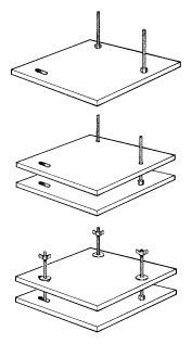 - Pass a bolt through the two round holes and secure with the two regular nuts, as shown in part one of the diagram at right. Tighten with a wrench until the bolt head is pulled in flush with the plate. Slide the remaining plate over the two bolts, as shown in part two of the diagram. Place a washer and wing nut on each bolt, turning the wing nut to about 1/2-inch down each bolt. Pass the third bolt up through the slot and add remaining washer and wing nut as shown in part three of the diagram.