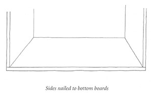 Start by toe-nailing the first bin board into the lower left corner of the frame. The edge of the bin board will be cut at a 45-degree angle to fit in the corner (see detail), making one side just slightly longer than the other. Don’t worry about it. Just make sure the slightly longer side measures 14 inches.