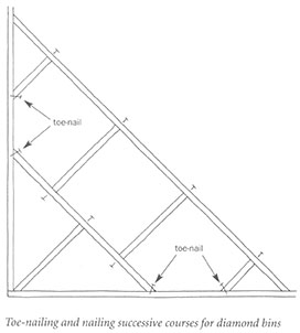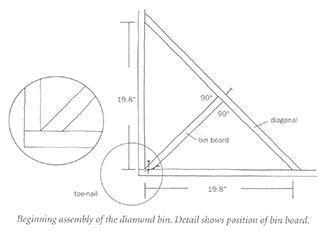 When assembling the diamond bins, you’ll need two kinds of boards that I designate bin boards and diagonals. Bin boards run up at 45-degree angles from left to right, and diagonals run down at 45-degree angels from left to right. Bin boards are all the same length (14 inches), but the length of diagonals will vary depending on their position in the frame. Your best bet is to cut and assemble each course as you work.