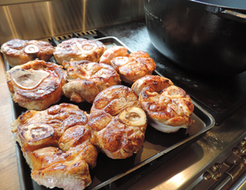 This dish is made using a cut of meat taken from the shin or shank of veal — one that many people will recognize from its Italian name, osso bucco. It is slowly cooked with wine and beef or veal stock — a technique called “braising,” which when done properly, can transform quality, inexpensive cuts of meat into heavenly deliciousness. The moist environment and 180–200 °F (82–