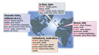 We set up worldwide winery trials using high-quality Chardonnay grapes from different wine regions of the world: Alexander Valley, California; Abruzzi, Italy; Stellenbosch, South Africa and La Rioja, Spain. We also selected different yeasts commonly used in those regions.