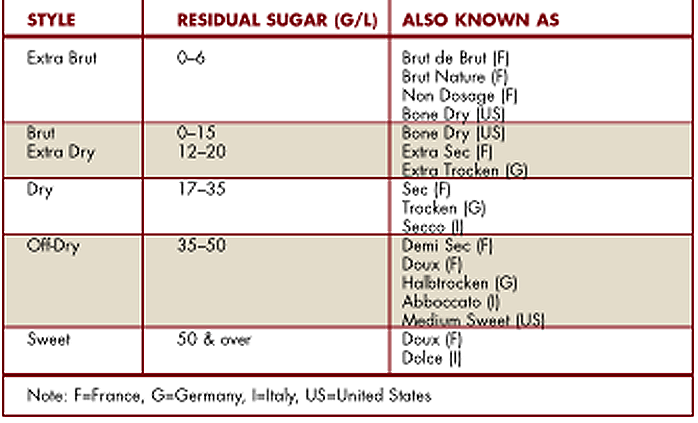 Countries have different designations and requirements relative to residual sugar content. (The table at right provides guidelines for many common styles.)