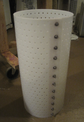 The first step to make was the basket (photo below). This required a sheet of 1⁄8-inch HDPE that is 24 x 38 inches (61 x 97 cm). This would make a basket with a diameter of around 12 inches (30 cm). I then drew a grid pattern on the sheet, drawing lines every inch (2.5 cm). At the intersection of each line I drilled a 1⁄4-inch hole with a standard drill bit. If you are concerned about evacuating the juice more easily, by all means drill more holes. Drilling or cutting HDPE is very easy. After a lot of drilling, I folded the sheet in a circular pattern to line up the last set of holes and inserted a 1⁄4-inch x 20 x 1-inch stainless steel carriage bolt (with a washer, lock washer and nut) through each.