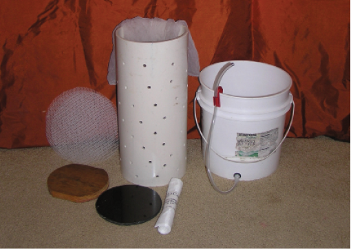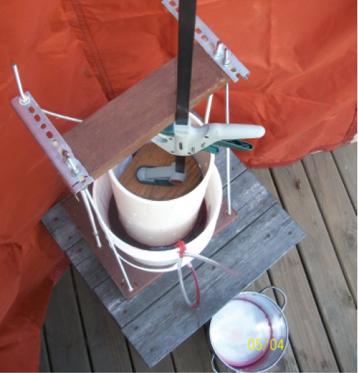 The current “press basket” is a 20-inch (50-cm) length of 8-inch (20-cm) diameter PVC pipe (burst strength rated at 250 pounds/113 kg). This is lined with a 26 x 26-inch (66 x 66-cm) fine mesh nylon straining bag that I use as a rough filter. I drilled drainage holes spiraled in 1⁄2-inch steps from the bottom to about 2 inches (5 cm) from the top of the pipe. This resulted in a 3.6-gallon (13.6-L) tube. For a top surface to press against, I first created an 8-inch (20-cm) plastic circle (in an earlier life a plastic cutting board) and several additional oak pressure plates giving a strong surface to push on. The juice is collected in a recycled food pail. A drainage tube is attached to the bottom and can be lowered to empty the juice. Some of the old wooden presses I have seen have drainage channels under the basket. The plastic mesh (formerly spacers in pizza boxes) allows