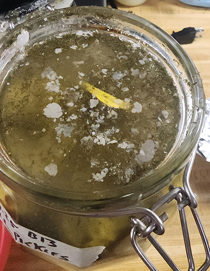 After fermentation is completed, occasionally you will see a secondary white yeast film grown on top that closely resembles a Pediococcus pellicle called kahm yeast. The word “kahm” comes from the German word Kan, which originated from the Latin word cana that describes the greyish layer of dirt on wine. Kahm yeast is a mixed culture consisting mainly of Pichia, Debaryomyces, Mycoderma, Hansenula, and Candida. Kahm yeast may not look appealing but is safe to eat. I scrape the kahm yeast off the top and discard; however, you may also find it attached to pickles. When this happens, I eat with no concerns.