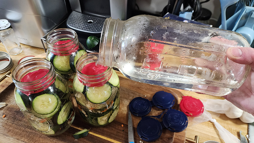 Weights: There are commercial glass weights that can be used to keep vegetables submerged under brine. Instead of buying them, I use the plastic can carrier tops often used with packaged craft beer 4-packs that are rated HDPE #2 (High Density Polyethylene) or rHDPE #2 (where the “r” stands for recycled). HDPE #2 plastic is safe for foods as they do not leach chemicals. The plastic 4-pack holders are the perfect size after cutting them into single can lids — getting four out of a carrier or into pairs getting two per carrier. Place the single lid on top of the vegetables then fold the double lid and place it on top. This will act like a spring on the jar keeping everything submerged under the brine.