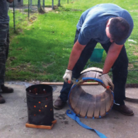 After the barrel is assembled, it’s time to toast (see photo on previous page). I heat for 20 minutes, until the staves approach 340 °F (171 °C), which is good for a heavy toast. At these temperatures the outside of the barrel is hot to the touch with leather gloves on, making it easier to bend and form. The fire and heat relaxes the white oak’s lignin while trussing. Oak is made up of a handful of varying constituents. Typical average compound concentrations in raw oak wood are 38–50% cellulose, 23–32% hemicellulose, 15–25% lignins, 10% ellagitannins, and the remaining 5% comprising other non-volatile compounds, volatile compounds, lipids (unsaturated fats and triglycerides), mineral elements (e.g., calcium, potassium and magnesium), and other trace elements and compounds. The lignin undergoes extensive changes as it is dried, bent, and toasted, which allows the wood to be formed. During the toast, the familiar volatile smell, a phenolic aldehyde byproduct known as vanillin, predominately mixes and fills the air. Vanilla, caramel, and burnt arm hair, yes burnt arm hair, will rise up with the occasional snap and pop from the cresset’s flame. I also listen for a distinguishing bellowing crack and boom, which warns of excessive barrel movement under the extreme heat. After 20 minutes of preheating and the lignins have relaxed, it’s time to hoop drive.
