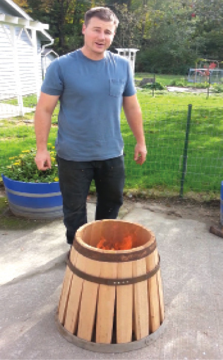 Barrel heads need to be exact, and fitting them is a challenge. I made a homemade bar gauge so I could measure the cask cross-sectionally from within the croze. The previously fired cask is never perfectly round, so a series of measurements are taken and averaged before the heads are cut out. The heads are 11⁄2 times the thickness of the staves and made of 5⁄4 lumber, which is 11⁄4 inches (3.1 cm) thick. It usually takes two or three pieces of lumber to make up a head. The pieces are loosely held together with wooden dowels. I’ve used everything from dried cattail reed to paper car gaskets in-between the doweled joints of the heads and have found the brown paper gasket material works best. The croze/head joint doesn’t get a gasket, the seal is created when liquid swells up and seals off the joint. I use a homemade bumper to set the heads in place. The bumper is a made from a piece of curved pipe and is useful for reaching inside the barrel and offering a helping hand while setting the heads. I finish off my barrels by spoke shaving and sanding them (see photo on this page). The barrels are left unfinished because they need to breathe to facilitate micro-oxygenation.