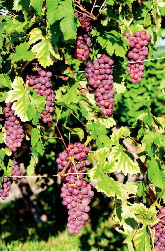 Gewürztraminer is classified as a white grape, however it has pink to red skin tones (see the photo on page 21). None of these pigments translate into the wine, even with some incidental skin contact. The variety has a characteristic spice tone for which the “Gewürz” in its name refers to. The grape is rich in terpenes, which when not bound to sugars in solution, play an important role in the spicy varietal character for which the wine is known for. Incidentally, terpenes are also responsible for the varietal character you would find in Muscat grapes as well. Terpenes in wine can be both free and bound. The term “bound” refers to the chemical bonding that takes place between the terpene and a mono- or di-saccharide sugar moiety, such as glucose (mono-) or arabinose, rhamnose or apiose, (di-). Bound terpenes are non-volatile, thus not contributing to the aroma profile.