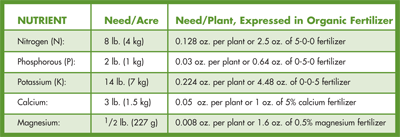 Note: Many backyard soils in the United States provide these nutrients naturally to the vines, year after year. This chart does not imply that all vineyards need to have these nutrients added. If your vines produce vigorous, green growth and good fruit year after year without adding fertilizer, there is no need to add further amendments or nutrients. Stunted, low-yielding or yellowed vines will benefit from nutrient additions early in the growing season, at flowering, and after harvest. Using compost or natural fertilizers can help the vine use the existing nutrients in the soil more effectively.