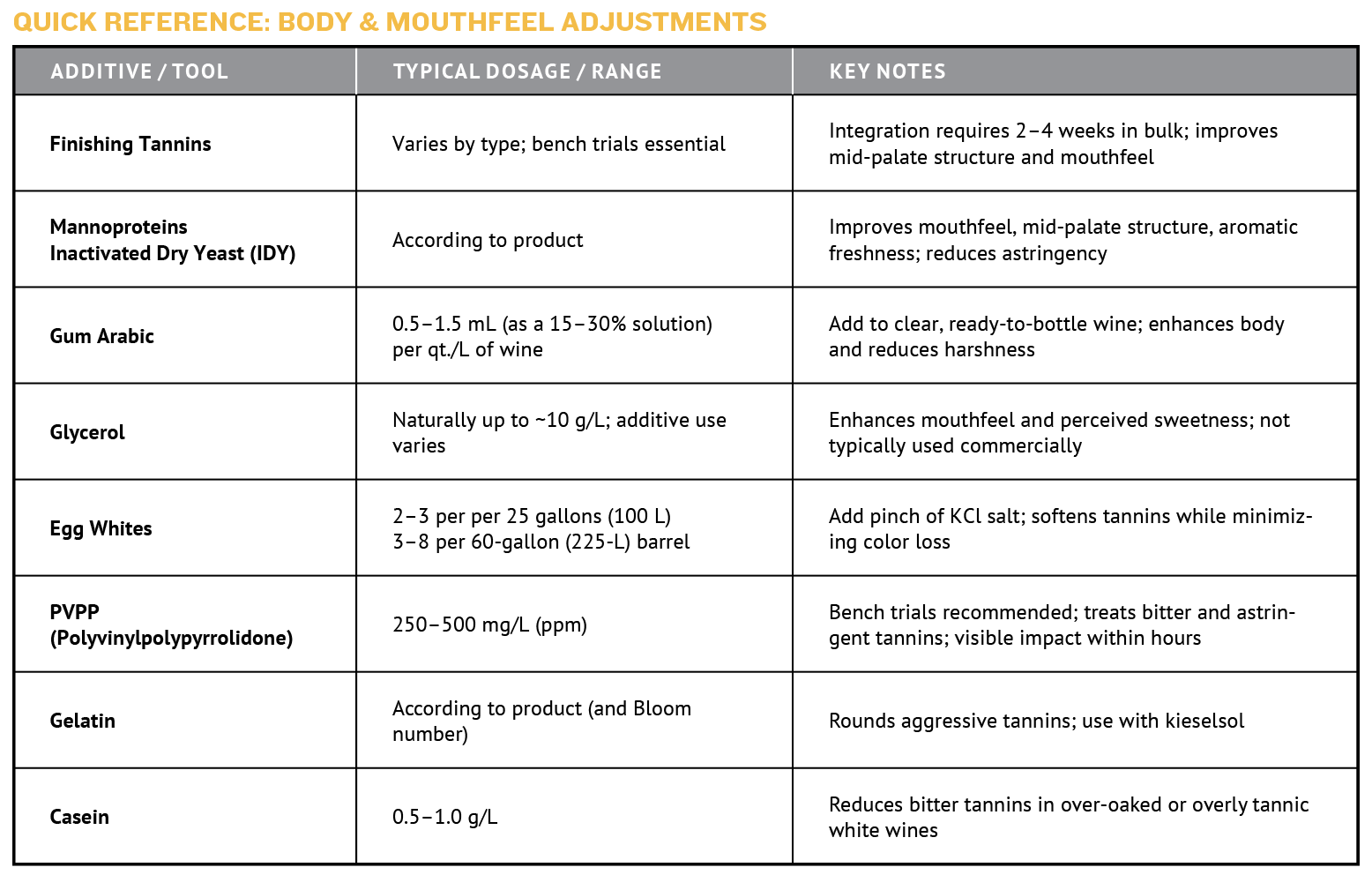 Thankfully, winemakers have a toolkit full of solutions to restore balance, enhance body and mouthfeel, or tame aggressive tannins. Tannins, mannoproteins, inactivated dry yeast, gum arabic, glycerol, and fining agents can all help — and sometimes in combination.