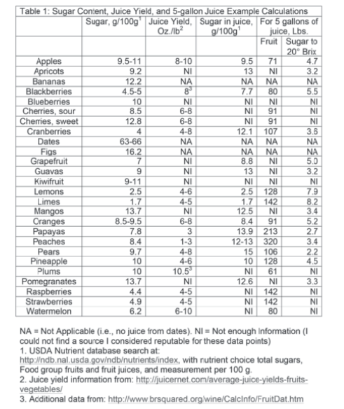 Rather than prescribe recipes, this article is intended to provide you with the calculations for determining your own approach. You can also juice some of your fruit and measure the sugar content with a refractometer or hydrometer and determine the yield by weighing the fruit and measuring the volume of juice produced in a measuring cup or graduated cylinder. For the calculations here, I am applying some basic assumptions. Since the data from USDA for sugar content are listed in g/100 g, it is easy for a winemaker to make the necessary calculations. Our old friend °Brix is defined as percent of sugar by weight, which happens to be exactly equivalent to g/100 g. The juice yield in Table 1 is calculated in fluid ounces of juice per pound of fruit. To get the metric version of L per kg of fruit, multiply by 0.065. As noted above, the last two columns assume a 5-gallon (19-L) batch.