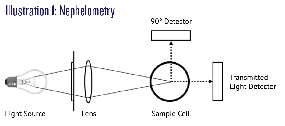 To measure turbidity precisely, winemakers rely on specialized instruments such as nephelometers and turbidimeters. Both use a beam of light directed through the wine sample, paired with a light detector positioned at specific angles (see Illustration above) to measure light scattered by suspended particles. Nephelometers position their detector at a 90-degree angle to the light beam, capturing the light reflected sideways, while turbidimeters may place the detector at various angles, such as 60 or 120 degrees. The results are expressed in Nephelometric Turbidity Units (NTU), where higher NTU readings indicate greater turbidity and, therefore, less limpidity.