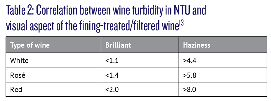 Table 2 shows the correlation between wine turbidity and the visual appearance of fining-treated or filtered wine.