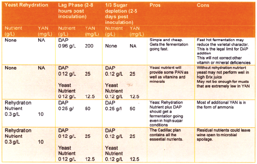 The first option is to add only DAP at the maximum legal limit (for commercial wines) at the beginning of the fermentation. This has been successful in fermentations where the varietal character was not of great importance and a fast fermentation was desired. The second option combines DAP and a complete yeast nutrient that will provide a small amount of PAN and some vitamins and minerals. Option 3 uses a rehydration nutrient which is a good way to get yeast started, especially if the conditions are particularly stressful such as cold temperatures or high °Brix. The fourth option combines rehydration nutrient with DAP and a complete yeast nutrient to give your yeast everything they could possibly need. Additionally there is a fifth option . . . which is to add nothing to your juice.